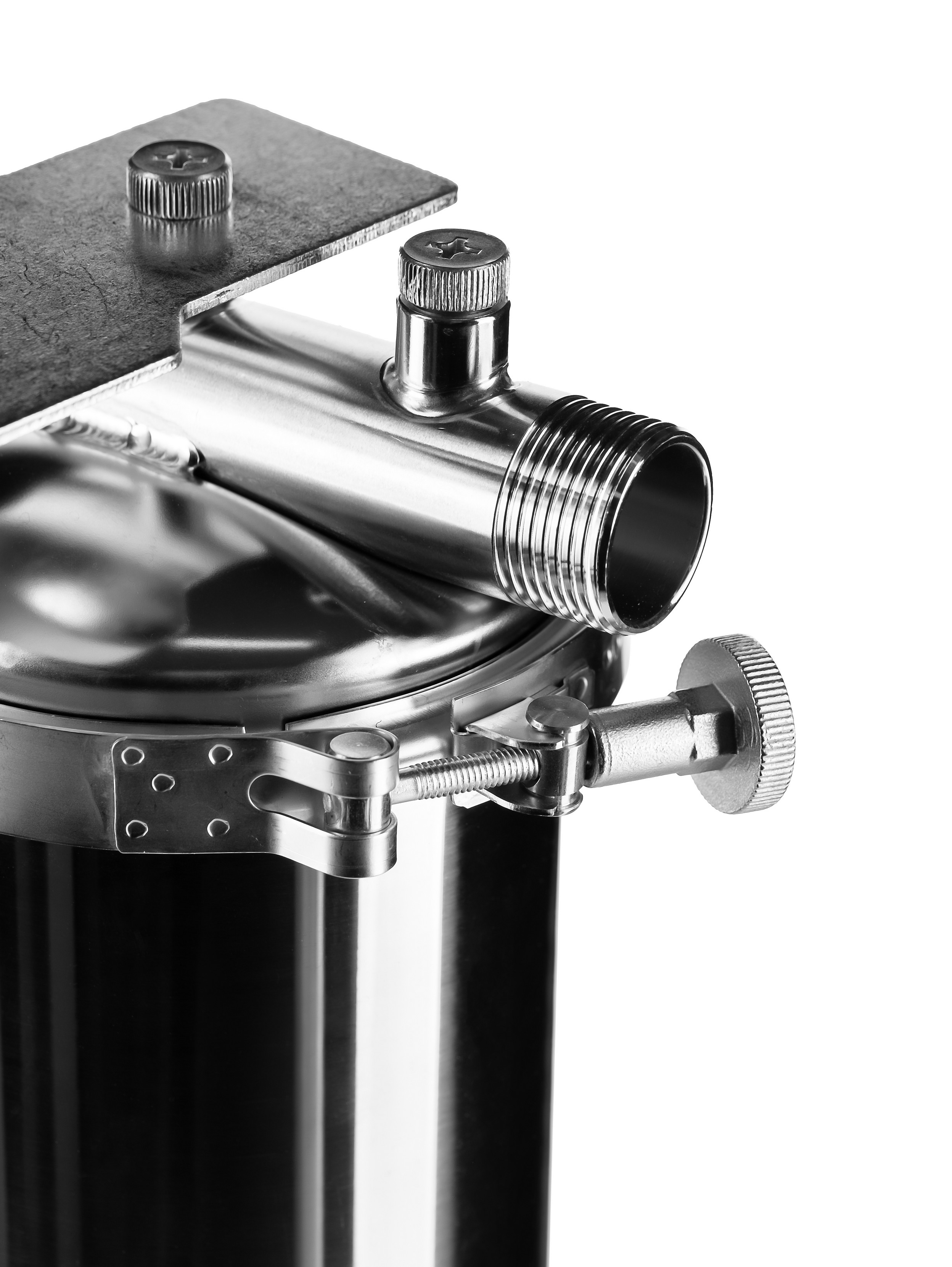 Корпус фильтра состоит из основания и крышки, соединенных между собой хомутом. Фильтрующая сумка вставляется в каркас жесткости. Сверху она закрывается крышкой каркаса и зажимается держателем. В комплект фильтра входит кронштейн для размещения его на стене.
