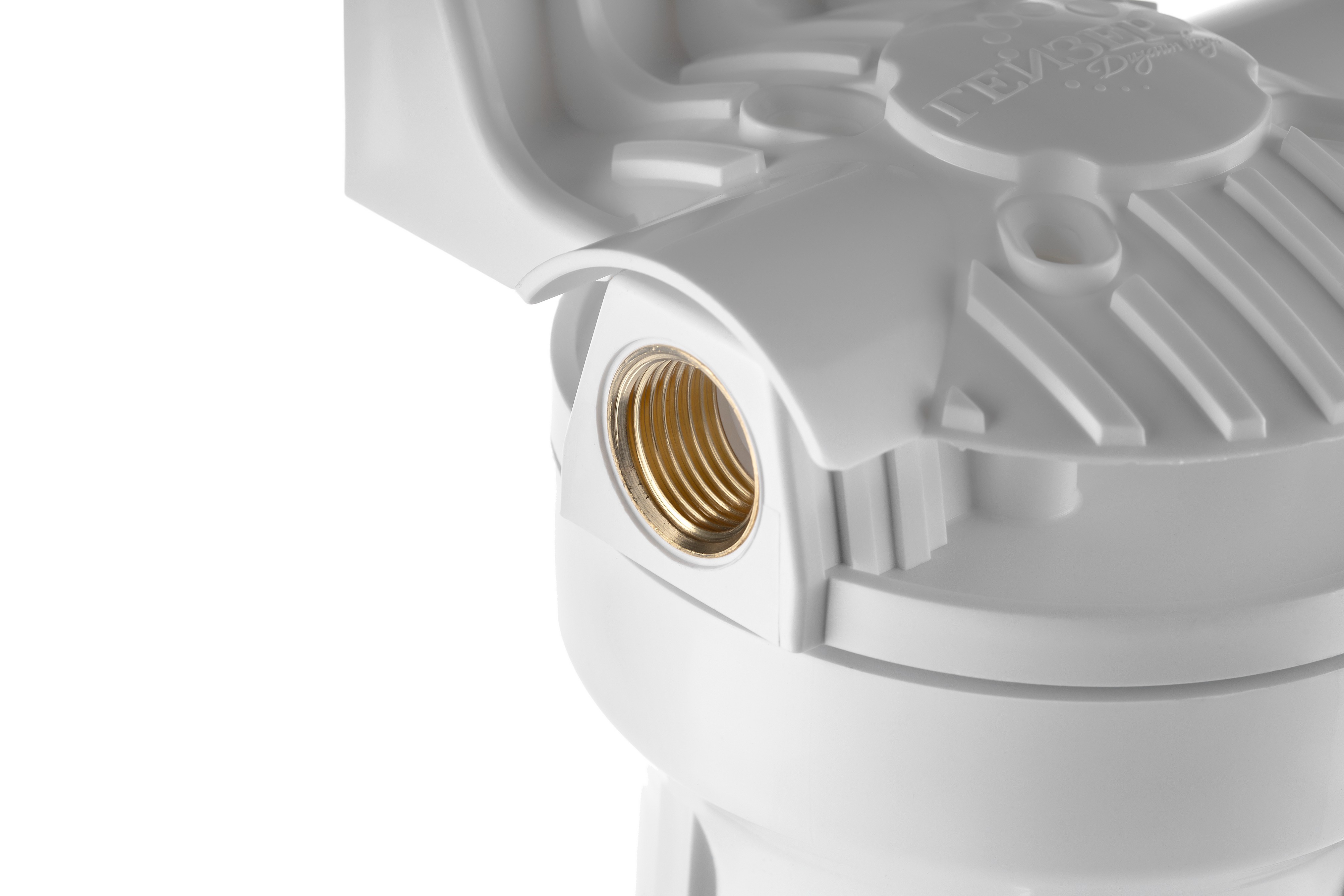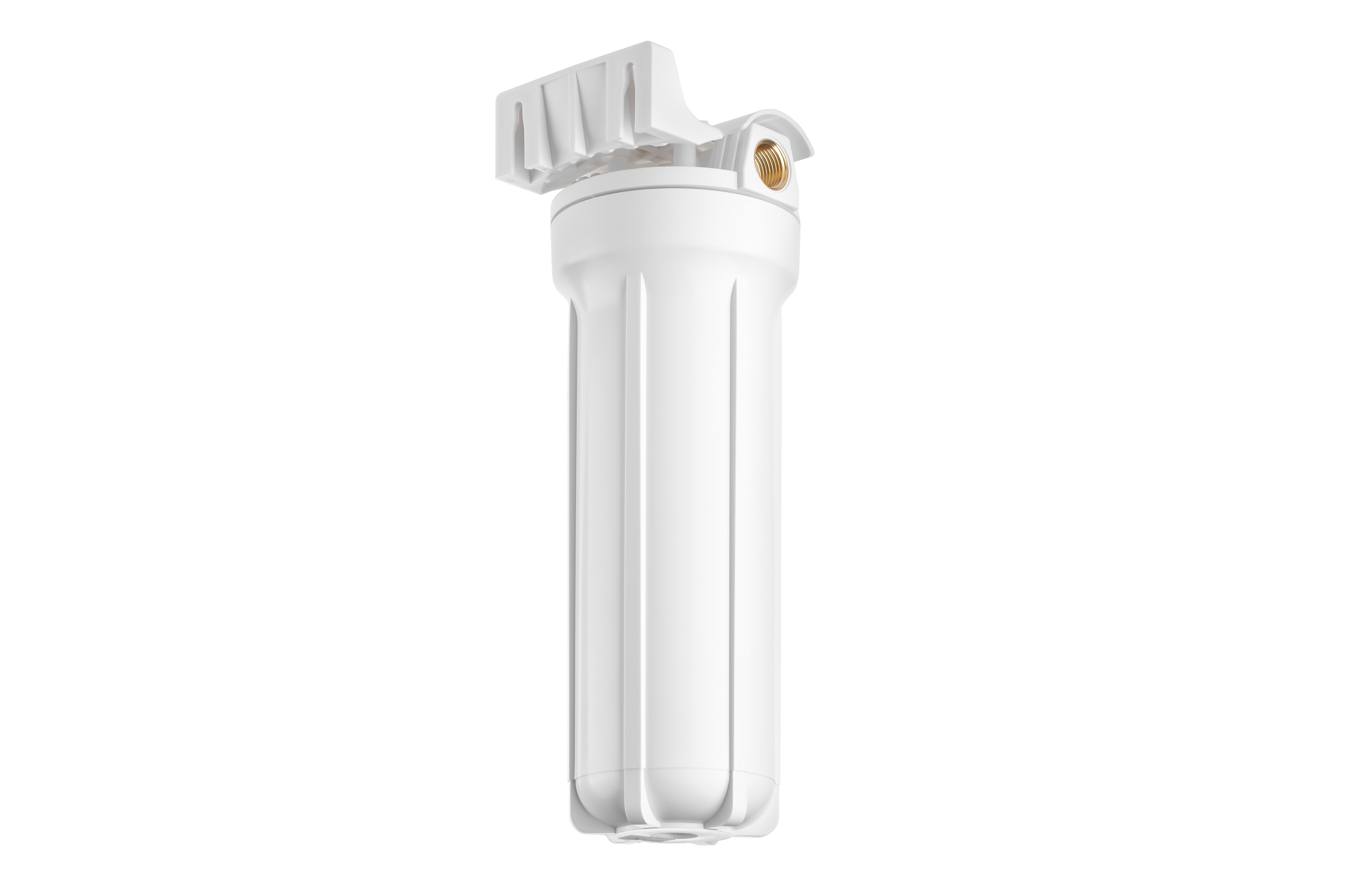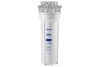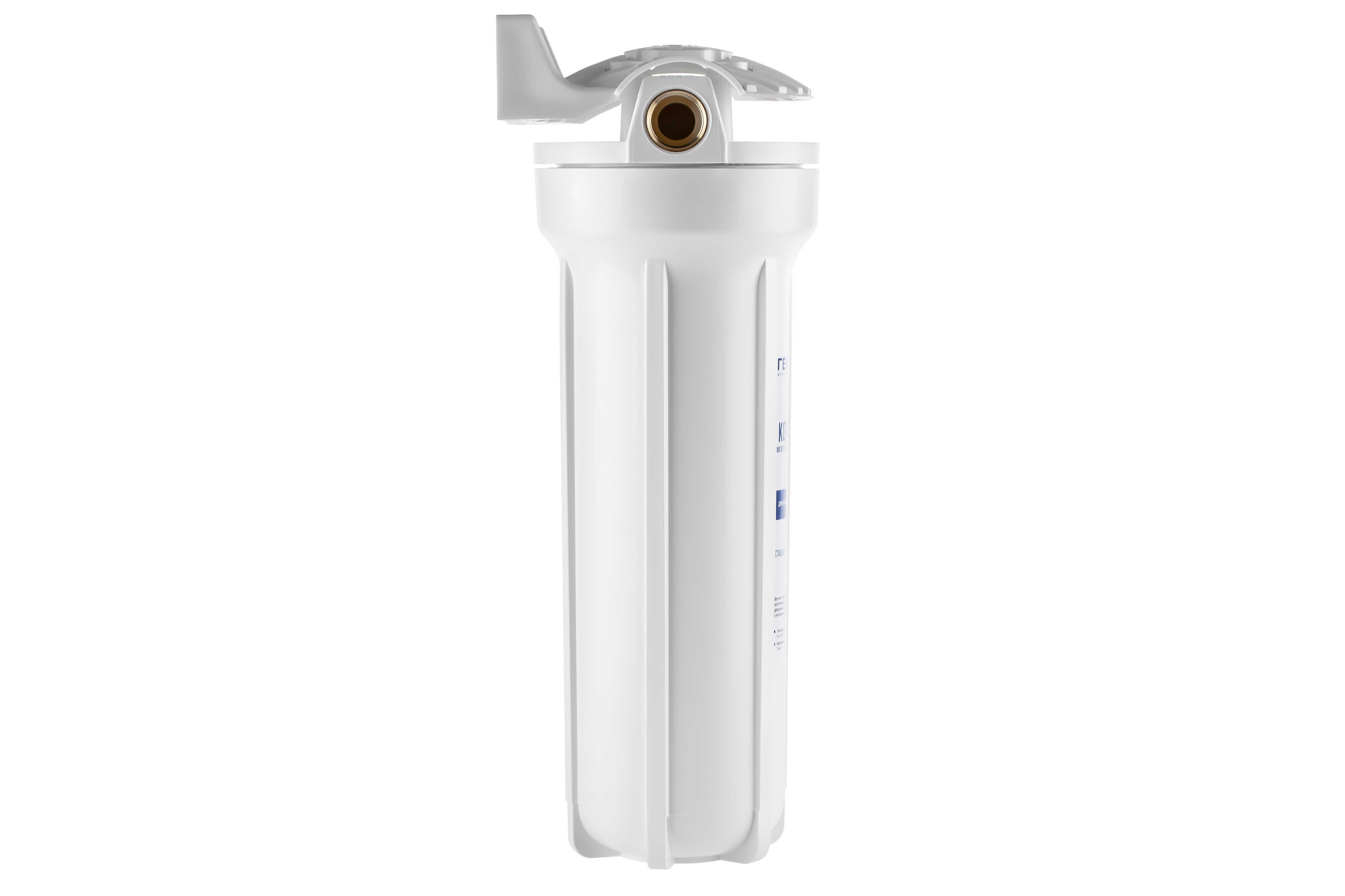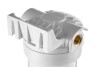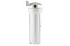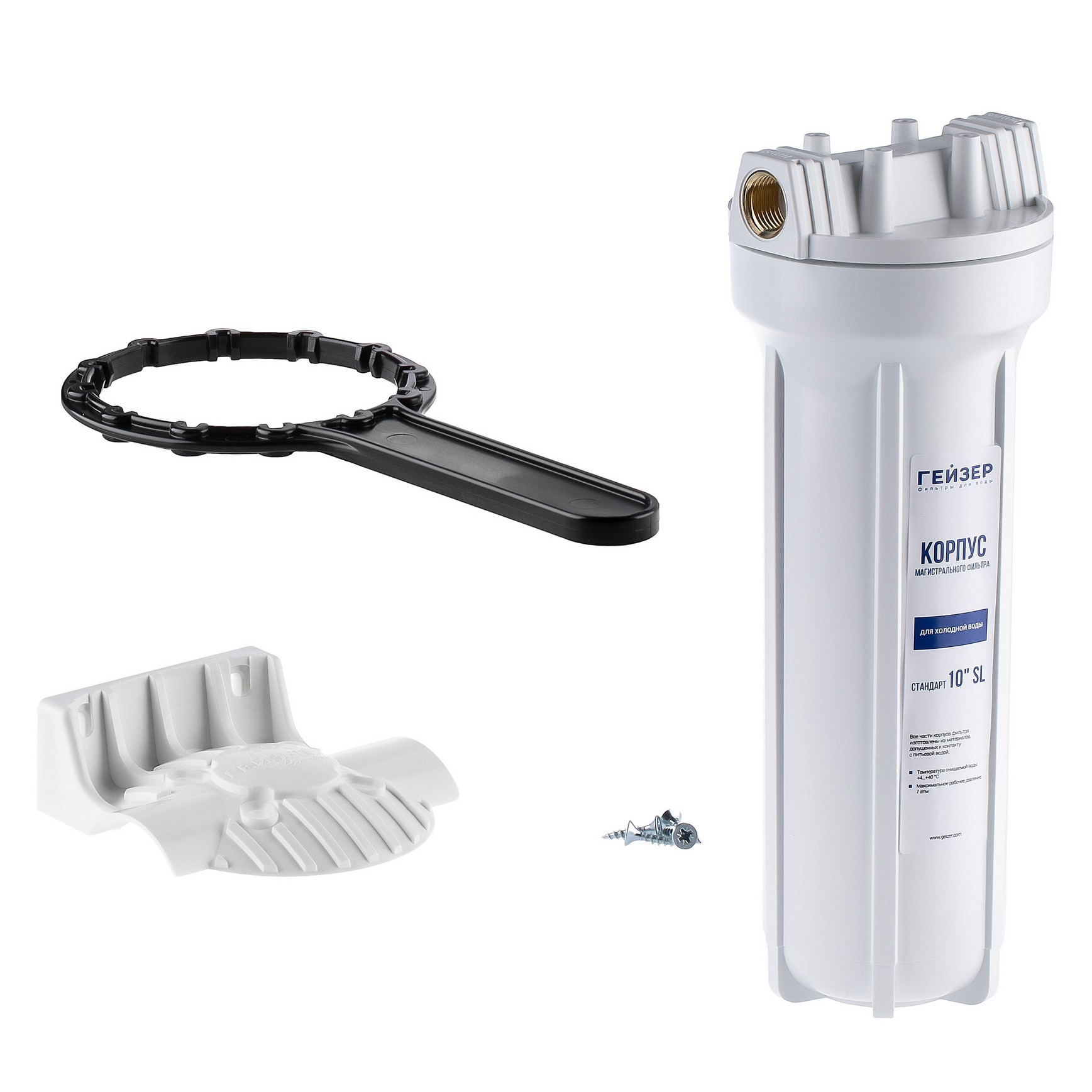 Корпус Гейзер 10SL изготовлен из белого полипропилена с латунными вставками и пластмассовой скобой . Корпус рассчитан на работу под давлением и установку на входе в систему холодного водоснабжения.