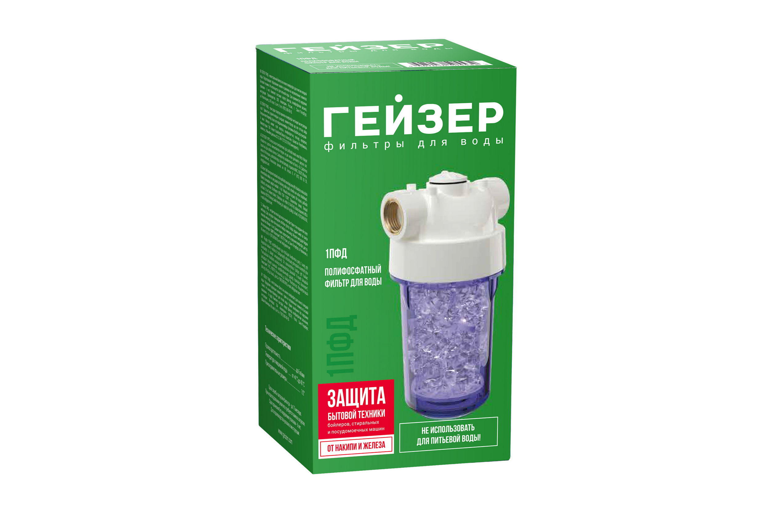 Фильтр Гейзер 1ПФД с полифосфатом используется для защиты нагревательных элементов стиральных, посудомоечных машин, водонагревателей и бойлеров от накипи и коррозии. Применяется для воды, используемой в технических целях (можно мыть посуду, стирать белье, принимать душ).