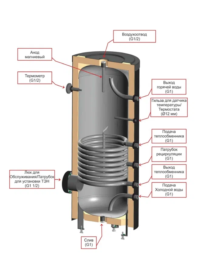Мощный змеевик позволяет быстро нагревать большой объем воды.
